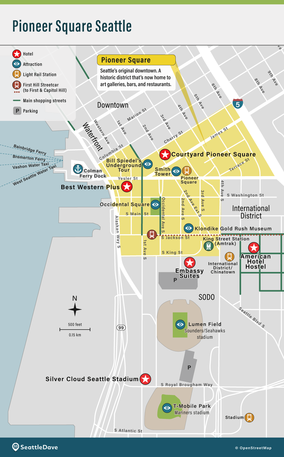 Hotels on Map: Courtyard Pioneer Square • Best Western Plus • Embassy Suites • American Hotel Hostel • Silver Cloud Seattle Stadium